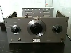 It was a low-distortion audio oscillator used for testing sound equipment. It used the Wien bridge oscillator circuit, that had been the subject of Bill Hewlett's masters thesis. It was also the first such commercial oscillator to use a simple light bulb as the temperature-dependent resistor in its feedback network.[2] The light bulb was an inexpensive and effective automatic gain control that not only kept the oscillator output amplitude constant, but it also kept the oscillator's loop gain near unity. The latter is a key technique for achieving a low distortion oscillator. Earlier, Larned Meacham had used light bulbs in bridge circuits to stabilize and linearize oscillators in 1938.[3]