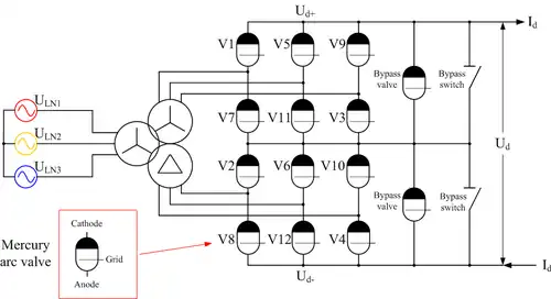 Mercury arc valves for HVDC were rugged but required high maintenance. Because of this, most mercury-arc HVDC systems were built with bypass switchgear across each six-pulse bridge so that the HVDC scheme could be operated in six-pulse mode for short periods of maintenance.[16][21]