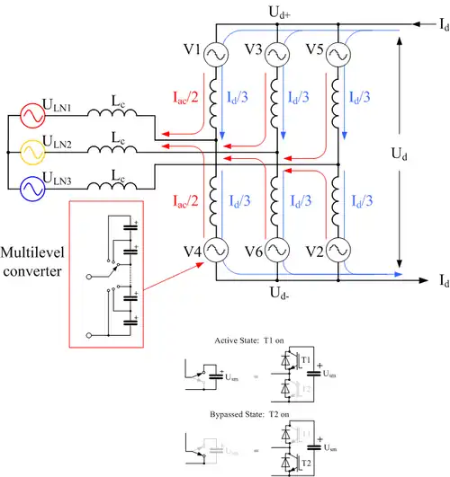 The MMC differs from other types of converter in that current flows continuously in all six valves of the converter throughout the mains-frequency cycle. As a result, concepts such as "on-state" and "off-state" have no meaning in the MMC. The direct current splits equally into the three phases and the alternating current splits equally into the upper and lower valve of each phase.[36] The current in each valve is therefore related to the direct current Id and alternating current Iac as follows: