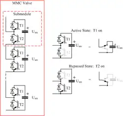 Like the two-level converter and the six-pulse line-commutated converter, a MMC consists of six valves, each connecting one AC terminal to one DC terminal. However, where each valve of the two-level converter is effectively a high-voltage controlled switch consisting of a large number of IGBTs connected in series, each valve of a MMC is a separate controllable voltage source in its own right. Each MMC valve consists of a number of independent converter submodules, each containing its own storage capacitor. In the most common form of the circuit, the half-bridge variant, each submodule contains two IGBTs connected in series across the capacitor, with the midpoint connection and one of the two capacitor terminals brought out as external connections.[36] Depending on which of the two IGBTs in each submodule is turned on, the capacitor is either bypassed or connected into the circuit. Each submodule therefore acts as an independent two-level converter generating a voltage of either 0 or Usm (where Usm is the submodule capacitor voltage). With a suitable number of submodules connected in series, the valve can synthesize a stepped voltage waveform that approximates very closely to a sine-wave and contains very low levels of harmonic distortion.