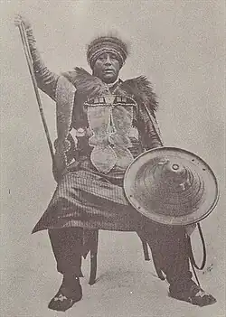 Fitawrari Habte Giyorgis Dinagde was born in Čabo, a district in Southwestern Shewa bordering the Gurage region and also a native of Waliso.[2][3] His ethnicity is disputed with claims that he was an ethnic Gurage.[4][1] and others claiming he was an ethnic Oromo.[5] Professor Lapiso states that Habte Girogis Dinagde was initially captured fighting under the Hadiya army led by Hassan Enjamo, he would however later switch allegiance and assist the Abyssinians in defeating the Hadiyans.[6] He was later trained in the art of warfare and promoted to a high rank in the empire's army under Emperor Menelik II. His early life isn't well documented, though many believe he came from a humble family.[3] He was later taken to Ankober, Menelik's Shewan capital, before Addis Ababa. As a young man he joined the forces of Menelik, then-King of Shewa.[3]