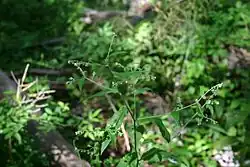 Hackelia virginiana has simple, rough leaves and ribbed green stems. The plant is categorized Wetland Indicator Status: FACU (Facultative Upland).[6]