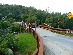In 1972 the Hadley Bridge, stressed by increased traffic caused by the closure of the Route 9N bridge to Lake Luzerne,[5] was closed for a while so that its structure could be strengthened. The cross braces were supplemented with a series of steel cable braces tightened with turnbuckles. The deck support system was changed from timber to iron, and the roadway itself was narrowed by 18 inches (46 cm) with a wooden curb so that it would only have enough room for one vehicle at a time, with a speed limit of 10 miles per hour (16 km/h), thereby further reducing loads.[2]