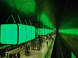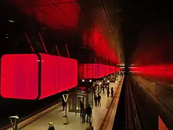 The station was designed by Munich-based architecture firm Raupach Architekten.[1] The design makes reference to the changing colors typical to the HafenCity, caused by reflections throughout the day by the wharf buildings' red brick and the ship hulls' iron and steel.
