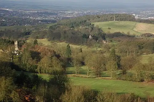 Hagley House is set in 350 acres (1.4 km2) of landscaped deer park grazed by herds of fallow deer. The grounds were landscaped between about 1739 and 1764, with follies designed by John Pitt (of Encombe), Thomas Pitt, James "Athenian" Stuart, and Sanderson Miller.[7] The follies include the Hagley Obelisk, built in 1764 for Sir Richard Lyttelton, which is visible for many miles.[8] The nearby reconstruction of the Temple of Theseus, built between 1759 and 1762, was a gift from Admiral Smith, Lyttelton's half-brother. This is currently in poor condition and has been listed on Historic England's Heritage at Risk Register for some years.[9] Others in the main park included some more classical erections and a sham ruined castle in mediaeval style.[10][11]