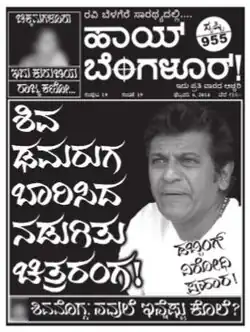 Hai Bangalore is a mass circulation weekly Kannada language tabloid published in Bangalore.[1] It was founded by Ravi Belagere along with R. T. Vittalamurthy, MaSuri, & Jogi in 1995 which he published from his Padmanabhanagar office in Bengaluru. The columns like Love Lavike, Bottom Item and Khaas Baat apart from Papigala Lokadalli which was about the underworld, created many admirers and his paper was the most-circulated newspaper over the five years.[2][3] The tabloid articles include reports about scandals, scams, affairs, background politics, murders, crime to the public eye, although the accuracy of the reports is often questionable. Apart from these reports, it contains columns and articles about various fields like psychology, sports, science and cinema news.
