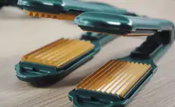 Hair crimping is usually achieved by treating the hair with heat from a crimping iron (also referred to as hair crimper) or by braiding the hair, often in multiple strands, then undoing the braids after a couple of hours. A crimping iron has parallel heated plates designed with a flat S-shaped repeating groove.