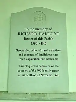 - ^ There does not appear to be any monument to Hakluyt either in Christ Church Cathedral, Oxford, or elsewhere in the grounds of Christ Church, Oxford.