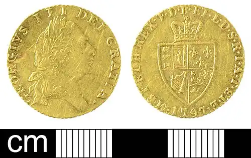 The half guineas of George III weighed 4.2 grams and were 20 millimetres in diameter except from 1787 when they were 20-21 millimetres in diameter. They were issued with seven different obverses and three reverses in 1762-1766, 1768, 1769, 1772–1779, 1781, 1783–1798, 1800–1806, 1808–1811 and 1813. All the obverses show right-facing busts of the king with the legend GEORGIVS III DEI GRATIA with different portraits of the king. The reverse of half guineas issued between 1761 and 1786 show a crowned shield bearing the arms of England+Scotland, France, Ireland and Hanover, with the legend M B F ET H REX F D B ET L D S R I A T ET E date. In 1787 a new design of reverse featuring a spade-shaped shield was introduced, with the same legend; this has become known as the Spade Half-Guinea.