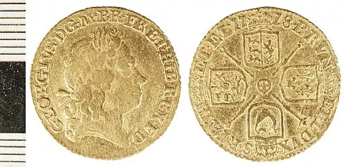 The dies for all half-guineas of Queen Anne and King George I were engraved by John Croker, an immigrant originally from Dresden in the Duchy of Saxony.[2]