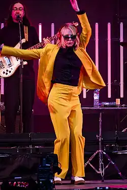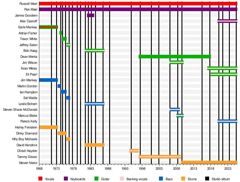Sparks is regarded as an art pop band.[92][93][94][95][96][97] Their musical style has varied dramatically with Russell Mael's distinctive wide-ranging voice (in particular his far-reaching falsetto) and Ron Mael's intricate and rhythmic keyboard playing style is the common thread throughout their fifty-year career. In its review of Kimono My House, NME described Russell's falsetto as a "stratospheric blend of Marc Bolan and Tiny Tim".[98] In the beginning, they attempted to emulate the sound of their English idols, such as the Who, Syd Barrett-era Pink Floyd and the Kinks, sometimes even pretending to be an English band while on the LA club circuit. They relocated to England during the glam rock era where, despite cutting an odd figure on this scene, they found success with their polished brand of intricate pop tunes and convoluted lyrics. Early albums such as Kimono My House combined glam rock with elements of bubblegum pop and baroque music. By the second half of the decade, they were concerned that the sound they had developed while based in England was in danger of becoming stale; they returned to LA, determined to adopt a more "West Coast" sound. This they achieved with producer Rupert Holmes on Big Beat and (sans Holmes) on Introducing Sparks.