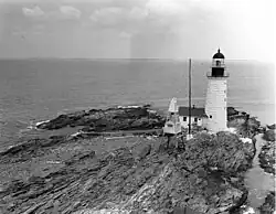 Halfway Rock Lighthouse is a lighthouse located on a barren ledge in Casco Bay, Maine.[5] The lighthouse tower, which has a height of 76 feet (23 m), and the attached ex-boathouse are all that remains, as the other buildings have been taken away in storms. The name "Halfway Rock" comes from the position of the rock which is halfway between Cape Elizabeth and Cape Small, the southwest and northeast extremities of Casco Bay, which are about 18 nautical miles (33 km) apart.