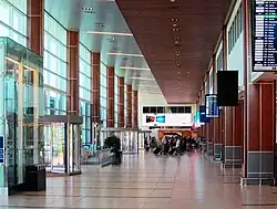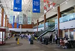 A new international arrivals area, three times larger than the previous one, opened at the north end of the terminal in August 2001. The upper level of this expansion included a space reserved for United States border preclearance facilities (see below).[33] A new domestic arrivals hall, accommodating three baggage reclaim belts and a Nova Scotia visitor's centre, officially opened on December 18, 2002.[34] Work also began in 2002 on a significant renovation to the central lobby of the terminal building. This expanded retail and dining space opened as the Airport Square on November 9, 2003. A third-storey public observation deck opened at the same time.[35] A southern terminal expansion was completed in 2005, expanding the departures holdroom, adding three new jet bridges, and creating a dedicated commuter aircraft facility with new ground-loading gates.[36]