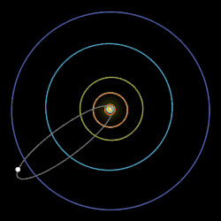 The orbits of the Halley-type comets suggest that they were originally long-period comets whose orbits were perturbed by the gravity of the giant planets and directed into the inner Solar System.[47] If Halley was once a long-period comet, it is likely to have originated in the Oort cloud,[48] a sphere of cometary bodies around 20,000–50,000 au from the Sun. Conversely the Jupiter-family comets are generally believed to originate in the Kuiper belt,[48] a flat disc of icy debris between 30 au (Neptune's orbit) and 50 au from the Sun (in the scattered disc). Another point of origin for the Halley-type comets was proposed in 2008, when a trans-Neptunian object with a retrograde orbit similar to Halley's was discovered, 2008 KV42, whose orbit takes it from just outside that of Uranus to twice the distance of Pluto. It may be a member of a new population of small Solar System bodies that serves as the source of Halley-type comets.[51]