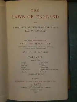 Halsbury's Laws of England is an encyclopaedia of the law in England and Wales.[1] It has an alphabetised title scheme for the areas of law, drawing on authorities including Acts of Parliament of the United Kingdom, Measures of the Welsh Assembly, UK case law and European law. It is written by or in consultation with experts in the relevant field.[1]