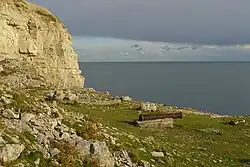 The ship had struck at the foot of a tall and near-vertical cliff near Seacombe, on the Isle of Purbeck, between Peverel point and St. Alban's head. It had run aground at the mouth of a cave 10 to 12 yards (9.1 to 11.0 m) deep in the base of the cliff, as wide as the length of the ship. Some of the sailors and soldiers managed to escape to flat rocks below the cliff and others to the rocks in the cave. The passengers and officers, numbering almost fifty people, including three black women and two soldiers' wives, took refuge in the round-house (cabin).[14] This was destroyed when a heavy sea washed over the wreck.[15] The same wave carried two men who had seized a hen coop onto the rocks, where they were badly bruised but safe.[16] It took less than an hour for the ship to be dashed to pieces.[8]