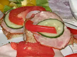 The ham sandwich is a common type of sandwich.[1] The bread may be fresh or toasted, and it can be made with a variety of toppings including cheese and vegetables like lettuce, tomato, onion or pickle slices. Various kinds of mustard and mayonnaise are also common.