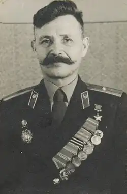 Together with him, the title of Hero of the Soviet Union was awarded to the gunner of his gun, Sergeant Stepan Nikiforovich Kuznetsov[1][7] and fellow soldiers: Senior Sergeant Aleksandr Mikhailovich Nemchinov[1][8] and Junior Sergeant Andrey Akimovich Kozorezov.[1][9]