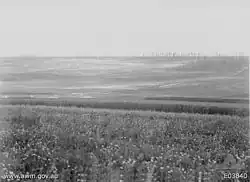 Pear Trench was south-west of Hamel on the "reverse slope of a gentle spur", Pear Trench formed the centre of the 4.0 mi (6.5 km) front over which the Australians attacked.[45] The 15th Battalion, from the 4th Brigade, was assigned to assault the position supported by three tanks.[11][38] From the outset things went awry. The tanks the 4th Brigade had been assigned got lost in the darkness and were late, the artillery preparation in this sector had fallen short, and some shells had landed among the 15th Battalion as they had formed up for the assault, causing casualties and leaving part of the German defences free to engage the infantry with machine-gun fire.[38]