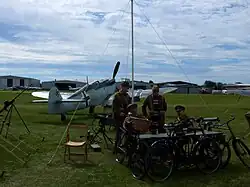 RAF Henlow was the film's base of operations for the restoration and modification of the Hurricanes and Spitfires, and it was here that the various marks of Spitfire were converted to resemble the 1940 variant.[21] Mahaddie's big coup was discovering that the Spanish Air Force was still using licence built Messerschmitt 109 fighters as trainers and Heinkel 111 bombers as transports, ironically both now powered using Rolls-Royce engines. He persuaded the Spanish air force to co-operate in the filming of Battle of Britain. This provided the film with its "Luftwaffe" aircraft.[19] All told he acquired the use of 115 British and German designed aircraft.[18]