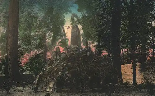 - ^ "Hamlet's Grave, Elsinore" Frank Leslie's New York Journal of Romance, General Literature, Science and Art, July 1856. "Hamlet's grave is marked by a single stone obelisk, evidently of very early date; it is surrounded by tables and chairs, where citizens from Copenhagen consume beer and coffee and defile with their heeltaps the sepulchre of a king."