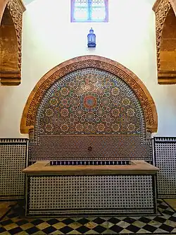 The layout of the hammam is similar to that of most historic bathhouses in the city and was inherited from the Roman bathhouse model. The first room entered from the street, and the largest,[1] was the undressing room (mashlah in Arabic or goulsa in the local Moroccan Arabic dialect), equivalent to the Roman apodyterium.[8][2] The reception room or changing room of the Saffarin Hammam distinguished itself by being more richly decorated than that of most Moroccan hammams.[8][2] The chamber consists of a large square marked out by four columns, covered by a large high dome, which is set inside a large square whose corners are covered by four smaller much domes. The main dome and the arches of the chamber are decorated with carved stucco motifs, while the lower walls are covered in zellij tilework. The southwestern wall of the chamber features a wall fountain decorated with colourful geometric patterns in zellij, below which is a water basin.[8][2][9] The chamber also includes seats and storage lockers around its perimeter. Near the entrance is also a reception area or desk where visitors can pay for services.[8][2] Visitors were generally entitled to four or five buckets of water, and had to pay if they wanted more.[8]