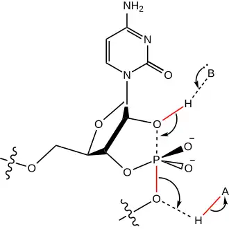 The cleavage reaction is a phosphodiester isomerization reaction that is initiated by abstraction of the cleavage-site ribose 2’-hydroxyl proton from the 2’-oxygen, which then becomes the attacking nucleophile in an “in-line” or SN2(P)-like reaction, although it is not known whether this proton is removed prior to or during the chemical step of the hammerhead cleavage reaction. (The cleavage reaction is technically not bimolecular, but behaves in the same way a genuine SN2(P) reaction does; it undergoes inversion of configuration subsequent to forming an associative transition-state consisting of a pentacoordinated oxyphosphrane.) The attacking and leaving group oxygens will both occupy the two axial positions in the trigonal bipyramidal transition-state structure as is required for an SN2-like reaction mechanism.