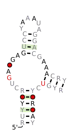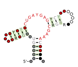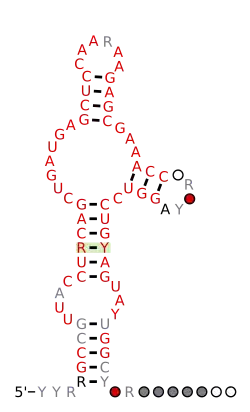 ![]() Predicted secondary structure and sequence conservation of Hammerhead ribozyme (type III) | |