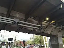 The Hammersmith flyover is an elevated roadway in West London which carries the A4 arterial road over and to one side of the central Hammersmith gyratory system, and it links together the Cromwell Road extension (Talgarth Road) with the start of the Great West Road. It is one of the first examples of an elevated road using reinforced concrete.[5][7]