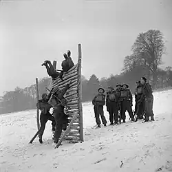 Men of the 2/4th Battalion, Hampshire Regiment scale an obstacle during 'toughening up' training in wintry conditions at Wateringbury in Kent, 20 January 1942.