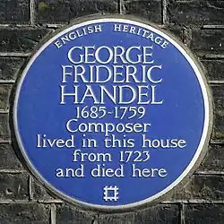 Handel acquired 25 Brook Street in the summer of 1723, shortly after having been appointed by George II as composer to the Chapel Royal, for which he was paid £400 per annum. The house had been newly built with Nos. 23, 27/29 and 31 by George Barnes as part of the planned extension of Brook Street, linking Hanover Square with Grosvenor Square, between 1717 and 1726. Originally, as a foreign national, Handel was not eligible to buy or take long-term leases on property in London; and even when he acquired British nationality in 1727, Handel continued renting the property on short-term leases. The fact that he remained there for the rest of his life, almost 40 years, is remarkable, since opera composers at the time were rarely of fixed abode; prior to that, Handel had been lodged in the homes of friends and patrons. At the age of 38, Handel had become accepted within the higher echelons of British society, with whom he freely mixed. His immediate neighbours on either side were from the upper middle classes and initially included the Member of Parliament, John Monckton, who later became the first Viscount Galway in 1727.[3] The layout of the rooms followed the conventions for a modest Georgian townhouse: the basement contained the kitchens; on each of the three floors above, there was a front room and a smaller back room with an adjacent closet; under the roof were garrets for servants.[4]