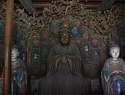 - Sanguan Hall (Hall of the Three Officials, 三官殿) - the largest hall in the temple, in which the "Three Great Emperor-Officials" (the officials of Heaven, Earth and Water) are worshiped with Ming era clay sculptures.