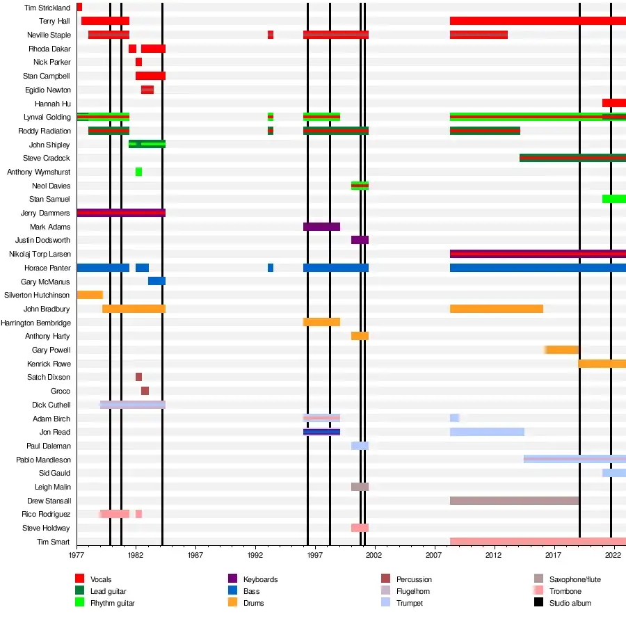 In 2008, Terry Hall reunited with the band, alongside Staple, Panter, Golding, Byers, Bradbury,[9] Birch and Read, and new members Nikolaj Torp Larsen (keyboards),[10] Drew Stansall (saxophone) and Tim Smart (trombone).[11] Birch had departed by 2010. Staple departed in January 2013, due to personal reasons.[12] Byers also departed in February 2014.[13] He was replaced by Steve Cradock.[14] The band were also joined by Pablo Mandleson on trumpet around the same time. On 28 December 2015, drummer Bradbury died.[15] he was replaced by Libertines drummer Gary Powell.[16] In 2019, Kenrick Rowe replaced Powell.[17] Stansall also departed. Sid Gauld briefly replaced Mandleson in 2021.[18] Also in 2021 Stan Samuel joined the band on rhythm guitar,[19] and Hannah Hu also joined on second vocals.[20]