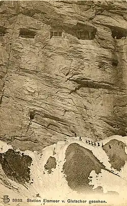 With the completion of the Jungfrau Railway, Kaufmann sometimes began his climbs of the Eiger or Jungfrau not just from the Eiger Gletscher station[51] (finished in 1898) but from the Eismeer stop (1905) and the Jungfraujoch terminus (1912) itself. For example, Kaufmann guided Stuart D. Morris with Edith and Gladys Hunt "up the Jungfrau from Jungfraujoch . . . [starting] at 6:30, [reaching] the summit at 5:50 and getting back to the Jungfrau station at 9:50."[52]