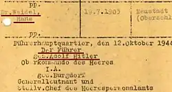 From 1939 to 1941, Weidel was Kreisgruppenführer (district group leader) of the National Socialist Association of Legal Professionals in the district of Leobschütz.[8] He joined the German army at the start of World War II. In March 1941, he took training as a military judge in Nazi-occupied Warsaw. He became a military judge at the Warsaw commandant’s office in July 1941.[7] On 12 October 1944, Adolf Hitler appointed him a Chief Staff Judge. He was responsible for sentencing opponents of the Third Reich.[9]