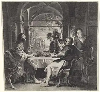 It is clear from the revision and production process of these prints that Rubens was closely involved in their design and execution.[5] This is documented by the process of the creation of a series of twelve plates after antique marble portrait sculptures (heads, busts, herms) by the four printmakers Hans Witdoeck, Paulus Pontius, Lucas Vorsterman, and Boetius à Bolswert working for Rubens. The production of the prints was closely supervised by Rubens as is demonstrated by five retouched proof impressions. Only six of Rubens' preparatory drawings for the series have survived.[6] Witdoeck showed in his prints after Rubens a great skill in capturing the movement and variety of colour in the original works through his clever use of black, grey and white tones. A typical example is Abraham and Melchizedek.[3]