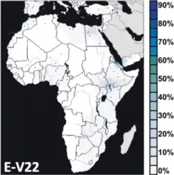 Outside of this core area of distribution (North Africa and the Horn of Africa), E-V68 is also observed in other parts of the continent at lower frequencies due to more recent dispersals. It is thus found today in pockets of the African Great Lakes and Southern Africa owing to early Afro-Asiatic-speaking settlers from the Horn region,[12] and as far west as Guinea-Bissau, where its presence has been tentatively attributed to trans-Saharan movements of people from North Africa.[14]