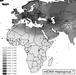 Mitochondrial clade T derives from the haplogroup JT, which also gave rise to the mtDNA haplogroup J. The T maternal clade is thought to have emanated from the Near East.