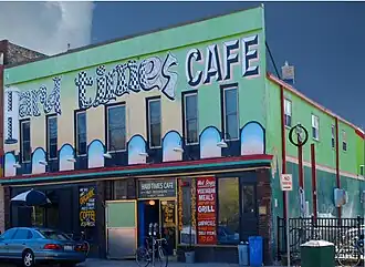 Hard Times was founded as a 24-hour cafe in 1992 by eight employees of The Cafe Expatriate, a failing restaurant at that location. Working with the vision of a place where all kinds of people could come together to drink coffee and eat vegetarian food, they transformed the restaurant into what is now Hard Times.[1] The location is a staple of the West Bank neighborhood, and a popular gathering place for local artists, musicians, students, and political activists.[2]