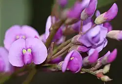 The flowers are arranged in racemes of between twenty and forty flowers, each on a pedicel mostly 2–4 mm (0.079–0.157 in) long. The sepals are 3–4 mm (0.12–0.16 in) long and joined at the base, forming a bell-shaped tube with triangular teeth. The petals are about 8 mm (0.31 in) long, mostly purple, the standard petal with a yellowish spot and a notch on the summit, the wings are egg-shaped with the narrower end towards the base and the keel is curved. Flowering mostly occurs from August to November and the fruit is a pod 20–45 mm (0.79–1.77 in) long containing between six and eight kidney-shaped seeds. The flowers are usually purple or violet, but pink, white and other colours sometimes occur.[2][5][6][7][8][9]