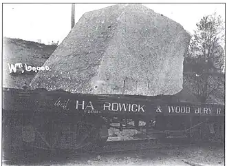 Largely as a result of the World’s Columbian Exposition in 1893, granite became a very popular building material for commercial and government buildings.[10][7]: 224 While the finer-grained granite of Barre was preferred for monuments and gravestones, the coarser-grained Woodbury stone found a market in "architectural" uses such as buildings and paving.[3] As demand grew, the granite-finishing operations in Hardwick began to look farther afield for sources of the raw stone. While some quarries had been opened in nearby Woodbury,[11] transportation of the stone to the finishing sheds was problematic: it was slow and difficult, and caused significant damage to the roads. The limitations of horse-drawn wagons would prevent much further growth in the local industry.[1] Ordinarily, a horse was needed for every ton of granite hauled by wagon.[8]: 4 It once took an 18-horse team three days to move a large column of rough granite from the quarry to Hardwick (a distance of 6 miles (9.7 km) or more, depending on the route), after which 20 road culverts needed to be rebuilt.[1][6] Such a team might be followed by a one-horse wagon loaded with axes, shovels, peavies, and other tools to repair the damage.[12] Transportation was somewhat easier in the winter, as the frozen ground would not give way, and snow allowed the use of sleds, which encountered less friction.[8]: 5