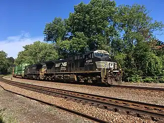 ![]() Eastbound Norfolk Southern intermodal train on the Harrisburg Line in Valley Forge, Pennsylvania; train traveling on Harrisburg Line's Reading Company main line trackage. | |