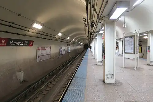 The station opened on October 17, 1943, as part of the State Street subway. The layout is typical of most stations from this section, with fare control on a mezzanine level between the street and platform. In 2006, the KDR standard signage at Harrison was replaced by the newer Current Graphic Standard signage. On February 9, 2009, an auxiliary entrance at Polk Street that was closed in 1968 was reopened due to an increase of both business and residents living in the South Loop neighborhood. On April 14, 2014, the Polk Street auxiliary entrance was temporarily closed, reopening on May 25, 2014. Later the same year, the main entrance closed on June 16 and reopened on July 28.[2] The station entrance at Harrison is located directly in front of Jones College Prep High School.