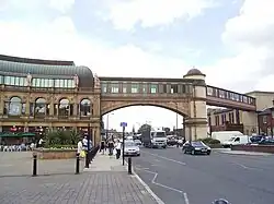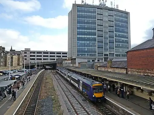 The station was largely demolished in 1964/65 and replaced with a more utilitarian one (with fewer platforms) by Taylor Bown and Miller, Architects (Harrogate). The platform awning on the west side had previously seen service in Sunderland and was re-used at Harrogate.[7] A car park now occupies the site of the former bay platforms on the south side.[8] It coincided with the loss of three of the main routes through the town in the Beeching Axe – both routes via Wetherby closed to passenger traffic on 6 January 1964 and the Leeds Northern route to Northallerton via Ripon on 6 March 1967.[9]
