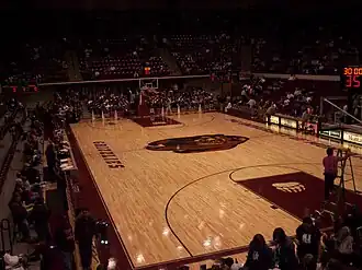 Opened in late 1953,[1][3][5] the field house was named for newly retired track coach Harry Adams in June 1966.[6] In the 1980s, Adams Field House seated over 9,000 and was known as the toughest arena for visiting teams in the Big Sky due to its belligerent crowd and (at one time) tartan flooring,[7][8] and also enjoyed a national reputation.[9] Its laminated wood arches were constructed in Portland, Oregon.[10] The elevation of the floor is approximately 3,200 feet (980 m) above sea level.
