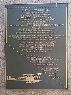 In early 1921 he sold some of his land to Wilkinson, Sands and Wyles Limited, who laid out the new suburb of Hendon.[9] The subdivision sale was successful; however with the novelty of aviation wearing off, the cost of joy flights (5 pounds for 10minutes, more than the average weekly salary for men and more than double that of women) and with some aerial mishaps, Butler was forced to close the company in September 1921.[1] He had previously offered to sell the remainder of his land to the Commonwealth in December 1920. The Department of Defence initially prevaricated, but in July 1922 compulsorily acquired the site, which was used as the first "Adelaide Airport" until 1927, when aviation operations were shifted to Parafield.[7]