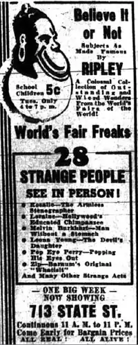 7. ^ A.W. Stencell (2002). Seeing Is Believing: America's Sideshows. ECW Press. pp. 145–146. ISBN 1-55022-529-4.