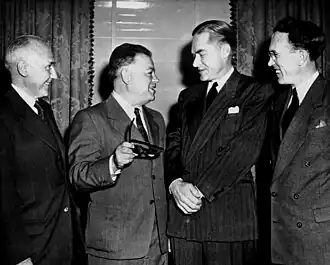 Laidler (far left) alongside David Dubinsky, Gordon R. Clapp and Tommy Douglas at a League for Industrial Democracy luncheon, 1949
