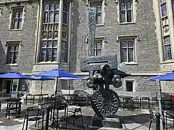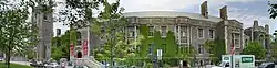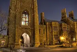 Hart House is a student activity centre at the University of Toronto's St. George Campus that offers programming for students across the university's three campuses. Established in 1919, it is one of the earliest North American student centres, being the location of student debates and conferences on the St. George campus since its construction. Hart House was initiated and financed by Vincent Massey, an alumnus and benefactor of the university, and was named in honour of his grandfather, Hart Massey.[1] The Collegiate Gothic-revival complex was the work of architect Henry Sproatt, who worked alongside decorator Alexander Scott Carter, and engineer Ernest Rolph, and subsequently designed the campanile at its southwestern corner, Soldiers' Tower. In 1957, the house hosted future U.S. President John F. Kennedy.[2]