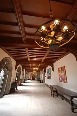 The majority of elements within Hart House hint at the Perpendicular style of Gothic architecture and thus generally line up in a row. Arches and vaults are the dominant structural form, however, there are parts of the building that employ lintels to create open spaces with flat ceilings (such as the East Common Room). The ceilings in the corridors and many rooms such as the Upper Gallery of the Great Hall are vaults with ridge ribs, but of particular emphasis is the treatment of the library ceiling that uses decorative Lierne ribs, which can also be seen in the entrance vaults. The general shape of the frontispieces and what appear to be Tudor-like archways mirror the shape of the chimney arches, while the decorative cinquefoil shapes used for the windows can also be seen in the woodwork of doors and trusses. The main entrance on the south side, the entrance on the west side, and the entire east wall is treated with a Perpendicular style parapet of battlements. The Gothic nature of the structure is emphasized through the structural systems, layout, and ornamentation, while the weight of stone is de-emphasized through its decoration, and its contrast with the thin stained-glass windows.